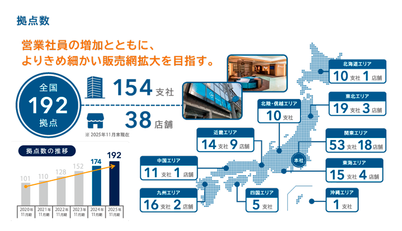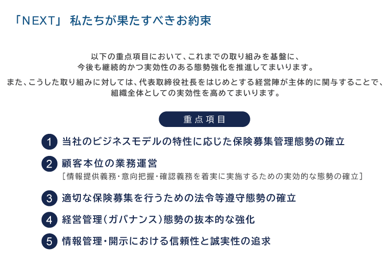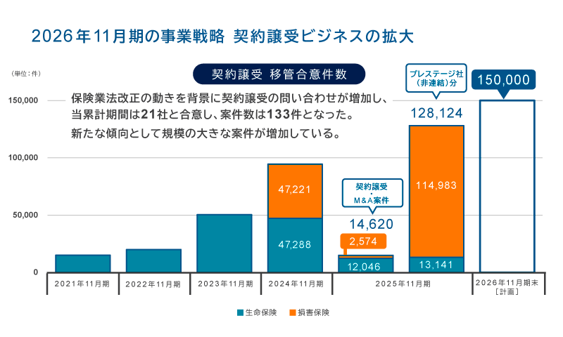TOP INTERVIEW 経営基盤の強化を全社一丸となって実行。 お客さま最優先のファイナンシャルプランニングと株主、投資家の皆さまの期待に応える企業成長のために邁進し、総合金融企業への進化を目指します。 経営基盤を再構築する施策を実行 2025年11月期は、まず2025年8月6日に受領した関東財務局からの業務改善命令を踏まえて、お客さま及び社会からの信頼回復と事業運営の抜本的な見直しに全社一丸となって取り組みました。 具体的な対応として、10月6日に同局に提出した業務改善計画を基に、改善に向けた態勢づくりとして、12月1日に業務改善会議、業務改善委員会、そして施策の検討や課題抽出を担う4つのワーキンググループを設置しました。 当社はお客さまの大切な資産を取り扱う金融業者であり、強固な基盤を持って活動していくことが求められます。 今回の指摘を新たなスタートを切る機会と捉え、改善施策の実効性の確認、改善活動の推進、現場社員からの意見の収集と全社での情報共有を通じた経営改善に取り組んでいきます。 また、この決意の表明として、2025年10月15日にコーポレートスローガン「NEXT」を発表しております。 ニーズの多様化とDXの重要性の高まり 保険代理店業界全体の動向として、改正保険業法の成立、規制強化、後継者不足やオーナーの高齢化などによる代理店の減少が進んだ1年だったと捉えています。 一方、消費者側では「貯蓄から投資」の流れが継続するとともに、「こどもNISA(未成年者向け少額投資非課税制度)」や「プラチナNISA(高齢者向け少額投資非課税制度)」導入の構想が進み、個人の資産形成への関心が高まりました。 時代とともに変化し多様化するニーズに幅広く対応し、お客さま本位で保険商品や金融商品の精査と選択の支援を行っていくために、お客さまの情報や市場のデータを利活用するDX環境を整備する重要性が一段と高まったと考えています。 契約譲受事業が次の成長ドライバー 事業面では、2025年11月期中に、「マネードクタープレミア」を新たに6店舗開店し、計36店舗となりました。 マネードクタープレミアは、保険をはじめとする各種金融商品について、プライバシーに配慮した個室で相談できる安心感が評価されるとともに、マネードクターのTVCMや人流が多い大型商業施設などへの出店によってブランド認知が高まっています。 当社の保有契約件数は1年間で約25万件の純増となり、総件数は2024年11月期比で約15%増となりました。 また、2021年にスタートした金融商品仲介業(IFA)は、保険にとらわれない総合金融企業としての提案強化を図り、NISAやiDeCo(個人型確定拠出年金)など投資信託の預かり資産が370億円近くまで増えました。 同じく2021年にスタートした契約譲受事業は、業務縮小や廃業を検討する保険代理店からの保険契約の移管が順調に進んでいます。 2025年11月期中の代理店からの相談件数は過去最高となり、1社あたりの移管契約数が増え案件の大型化が進みました。このような取り組みの結果、各事業で新たな成長の兆しが見え始めました。 しかし、新規契約の獲得や営業社員の採用に苦戦したことにより、2025年11月期の売上高は321億4百万円(前期比9.9%減)となりました。 営業利益は29億84百万円、当期純利益は20億42百万円となりました。 当社は創業以来15期連続で売上高を拡大してまいりましたが、2025年11月期に初の減収となりました。 一方で、経営基盤強化にひもづく各種施策の効果としてガバナンスなどの守備固めが進みました。 また、次の成長を見据えたDX投資も行い、売上面でも期中の後半は回復傾向となったことから、守りと攻めの両面で持続可能な事業成長を実現できる態勢を構築できたと考えています。 移管契約とクロスセルの提案に注力 2026年11月期は、足元の取り組みとして改正保険業法の施行を見据えた整備を進めます。 2026年は生命保険業界にとって大きな変革の年になるのではないかと感じております。当社は関連法令に基づく改善に引き続き取り組むとともに、新たなシステムの導入と稼働もスタートします。 このシステムによって、お客さまの意向把握や商談履歴の記録などを一括管理し、お客さま対応の標準化を進め、営業社員の業務効率も向上します。 また、お客さま情報を適切に管理して活用することで、提案など営業プロセスの最適化と業務品質の向上につなげることができます。 新たな事業の柱である契約譲受では、2025年11月期末に大型の移管が決まりました。 年間目標として10万件の移管を掲げてきましたが、本案件は1社で13万件弱の移管となる大型契約で、売上高を大きく押し上げると見込んでいます。本事業によって当社が保全業務を引き継ぐお客さまには、当社が取り扱う生命保険と損害保険を合わせて40社以上の商品から、お客さまのニーズに合う商品をご提案する機会になります。 また、お金のかかりつけ医であるマネードクターとして、資産形成、老後資金、介護資金などの相談にもきめ細