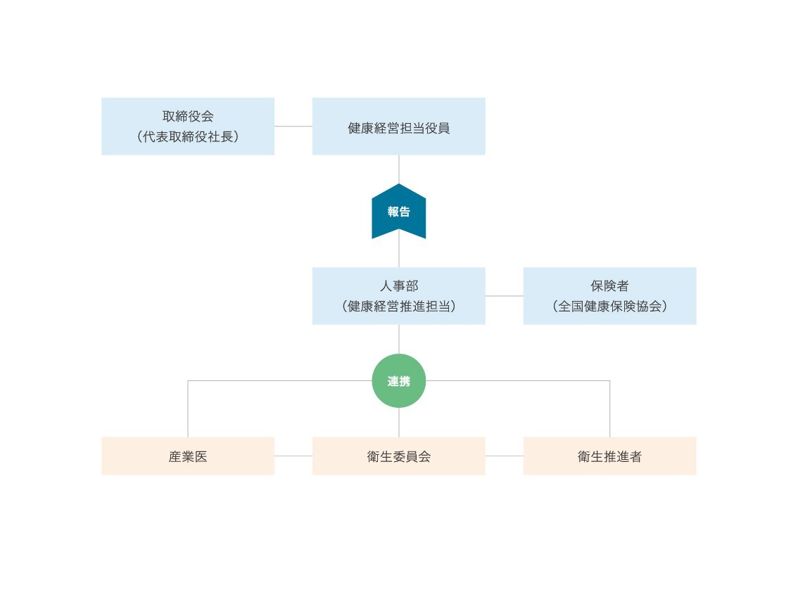 当社は、代表取締役社長を責任者とし、人事部の健康経営推進担当を中心に、保険者と協議し、産業医・衛生委員会等と連携の上、健康管理の推進・実施に取り組みます。